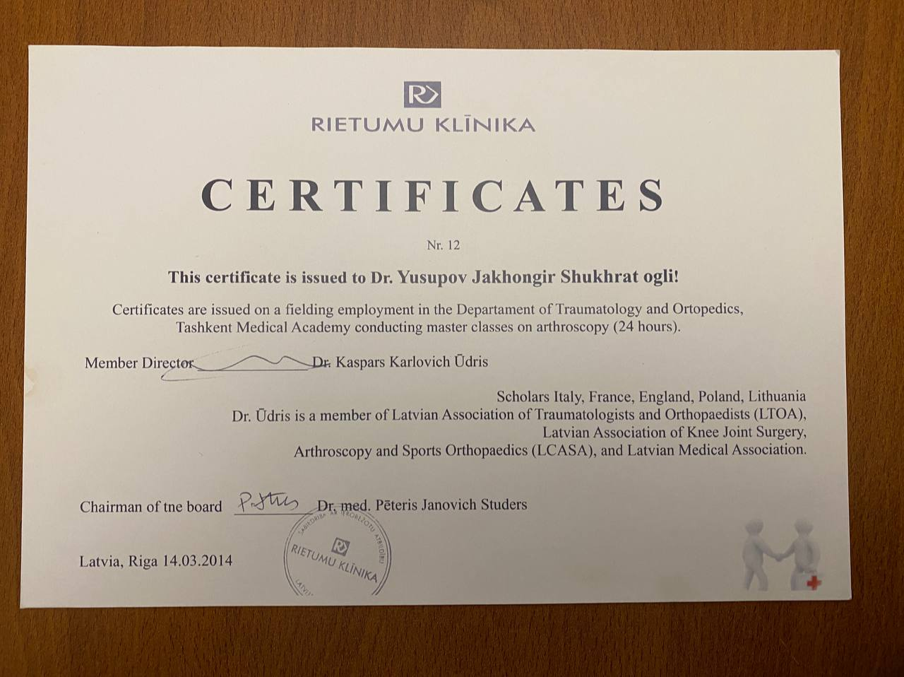 Доктор - Юсупов Джахонгир Шухратович ортопед травматолог, специализирующийся на лечении пациентов с травмами и заболеваниями опорно-двигательной системы,занимается артропластикой (эндопротезирование крупных суставов), а также артроскопией коленного сустава. Так же лечит артрозы коленного и тазобедренного сустава, спортивныe травмы и прочие ортопедические заболевания.Его великолепные навыки и многолетний опыт позволяют ему осуществлять эффективны методы для лечения пациентов всех возрастов. Джахонгир Шухратович после окончания школы , поступил в Медицинский Университет.В 2013 году закончил «Лечебный факультет» Ташкентской Медицинской Академии, в 2016 году магистратуру кафедры травматологии и ортопедии ТМА по специальности врач травматолог-ортопед. Его страсть к ортопедии родилась во время учебной практики.Поэтому, закончив обучение, Джахонгир Шухратович решил специализироваться именно в этой области.На сегодняшний день провел множество операций, которые были признаны успешными. Его подход к лечению основан на индивидуальном подходе к каждому человеку, учитывая его особенности и потребности. Он также активно участвует в научных исследованиях и конференциях. Многократно проходил стажировку, обучался в известной клинике «Max Super Speciality Hospital, Patparganj» (Индия), под руководством Профессора Анилa Ароры. Закончил полный курс обучения по Эндопротезированию суставов и Артроскопии коленного сустава, а также проходил стажировку в Германии.Активно участвует в международных конференциях по направлению ортопедии и травматологии. Занимается обучением молодых специалистов по направлению эндопротезирование крупных суставов. С 2017 до 2019 работал врачом травматолог-ортопедом в клинике "Akfa MedLine". C 2019 года по настоящее время работает врачом травматолог-ортопедом в клинике ЭраМед.